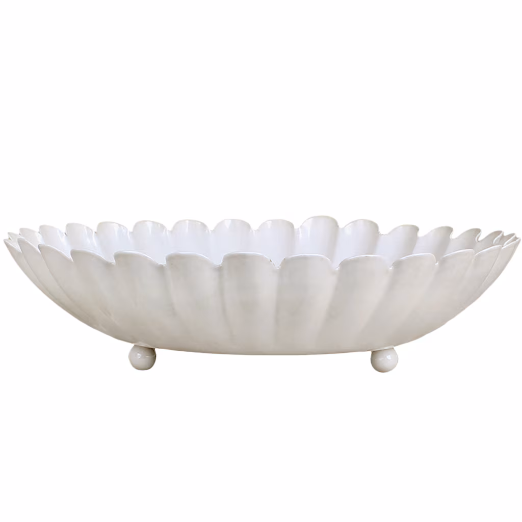 Dekoracyjna misa Ingrid to wyjątkowy element, który łączy rzemiosło, elegancję i naturalny charakter. Wykonana z metalu i osadzona na trzech okrągłych nóżkach, zachwyca delikatnie falowaną krawędzią oraz subtelnym, marmurkowym wykończeniem w odcieniu Antique White – ciepłej, postarzonej bieli, która pięknie komponuje się z zielenią roślin i naturalnymi materiałami. Jej forma nawiązuje do klasycznych mis ogrodowych i rustykalnych naczyń z dawnych oranżerii.